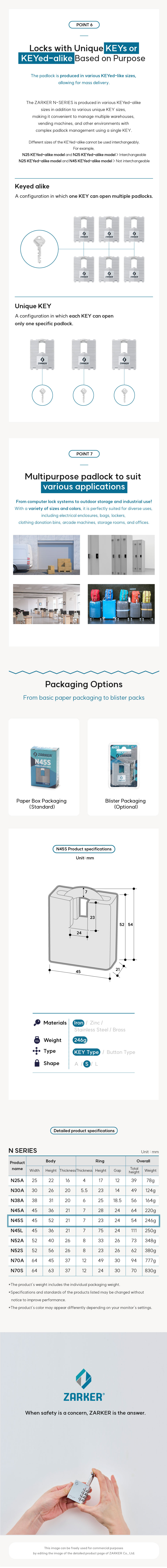 To inquireZARKER N-Series steel plate padlock is a padlock made by laminating steel plates. Unlike the existing locks that are made by casting and have a hollow interior, this lock is made by laminating, making it sturdy and heavy. The locks also have a coating that reduces rust and are available in a variety of colors.