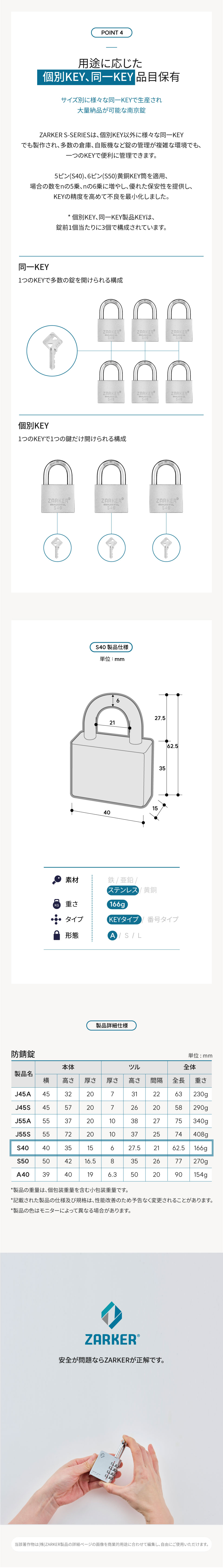 (株)ZARKER S-シリーズは腐食に強いサビ防止専用南京錠です。