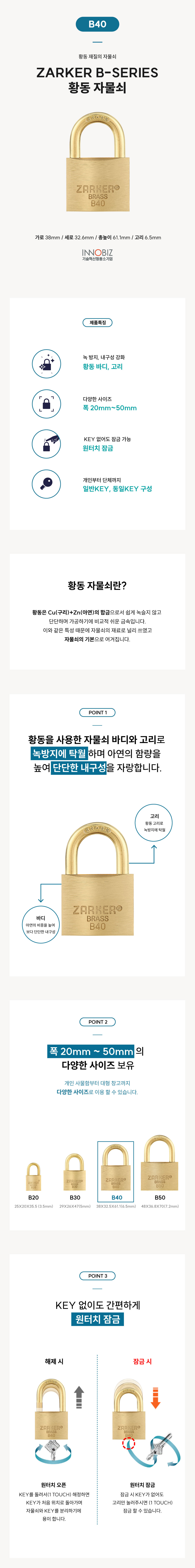 ㈜자커 B-시리즈 황동재질의 고리를 적용한 자물쇠입니다.
