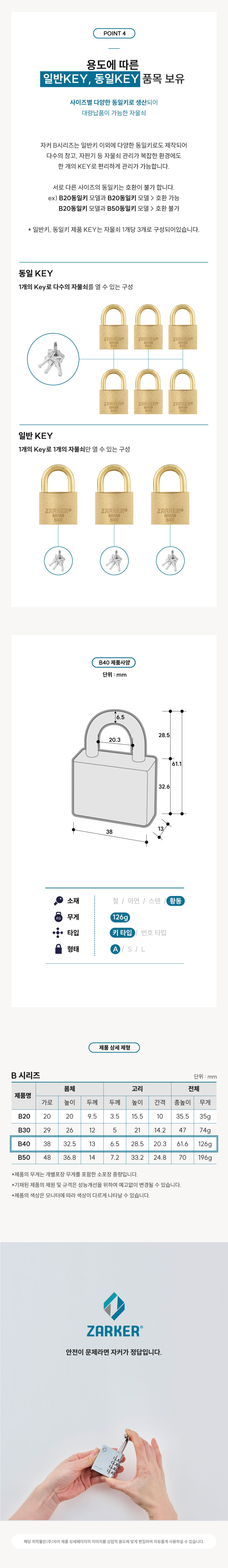 문의하기㈜자커 B-시리즈 황동재질의 고리를 적용한 자물쇠입니다.